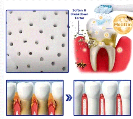 Okrem silného fyzického čistenia účinná látka včelí jed v exkluzívnom zložení Focussmile okamžite zmierňuje bolesť pri citlivom čistení zubov, účinne rozpúšťa zubný kameň, preniká hlboko do malých priestorov a drážok zubov a dôkladne odstraňuje zubný plak. Zložky včelieho jedu zároveň prispievajú k regenerácii poškodeného tkaniva ďasien, znižujú krvácanie ďasien a dokonca dokážu opraviť štruktúru zubov s začínajúcimi kazmi, čím zásadne chránia vaše zdravie ústnej dutiny.